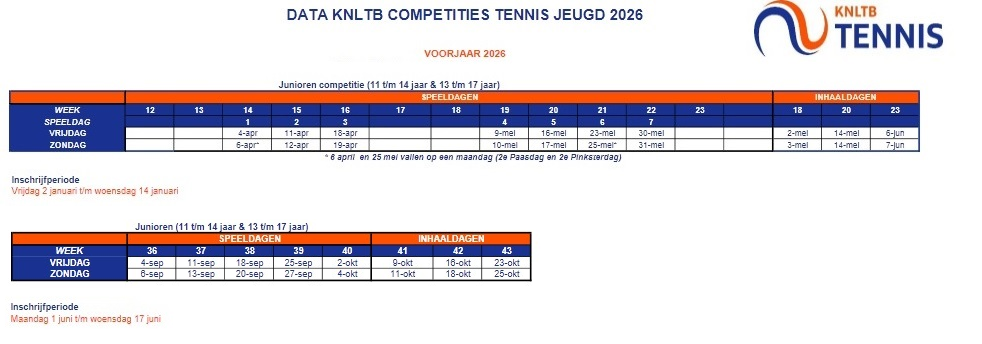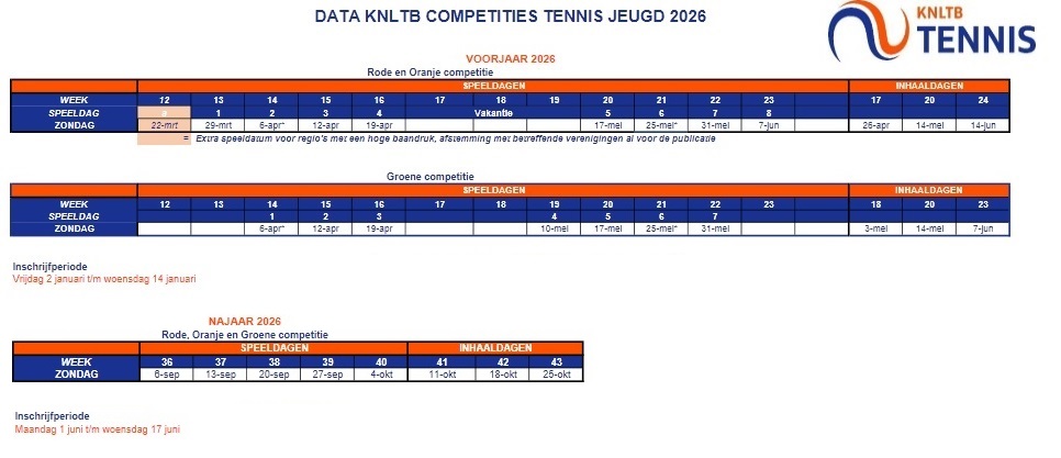 De Rode competitie en de Oranje competitie bestaan uit vijftien speelmomenten, verdeeld over meerdere maanden in het jaar. Voor kinderen die in Groen tennissen is er een voorjaar- en najaarscompetitie: de Groene competitie. Ook kunnen kinderen uit de provincies Noord-Brabant, Limburg en Noord-Holland meedoen aan de Wintercompetitie. De speeldata van alle competities kun je via de downloads onderaan op deze pagina bekijken.